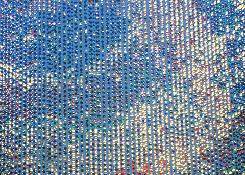 Orbit is a permanent sculpture that hangs from the atrium space in the main concourse of St. Johns shopping centre in Perth. It was commissioned by Grosvenor Estate Holdings in 1996 and this was my first permanent public commission. I obtained a satellite photograph of Perth and pixelated the image to form the basis of the composition of coloured beads. The work comprises 26,000 glass faceted beads that are glued at regular intervals onto fine stainless steel cable. The strands of beads are attached to a steel ring creating a cylindrical form. The image has no beginning and no end: an orbit. I worked closely with architects Reiach and Hall and lighting designers Jonathan Speirs & Associates in order to realise the work.